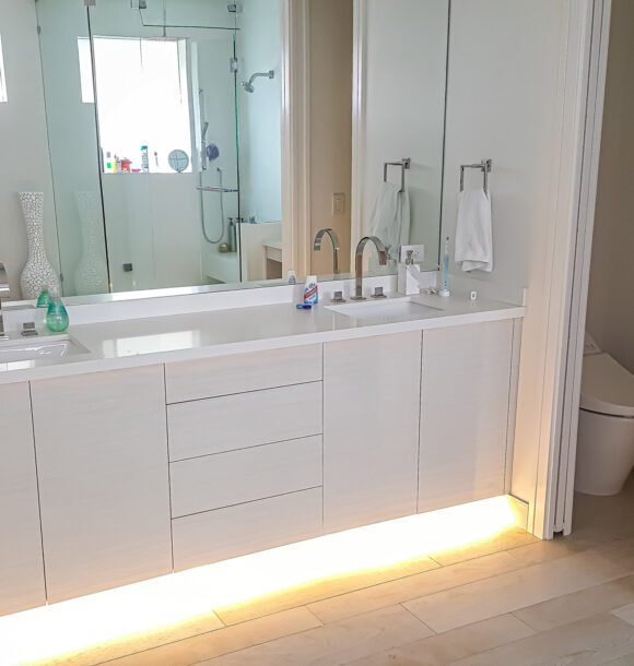 The completed custom bathroom cabinetry transformed our client’s bathroom into a luxurious and functional space. The cabinetry provided ample storage, keeping the bathroom organized and clutter-free. The elegant design elements, such as the custom finishes and integrated lighting, added a touch of sophistication and warmth to the room. Our client was thrilled with the transformation, noting how the new cabinetry enhanced the overall look and feel of their bathroom, making it a true oasis of comfort and style.