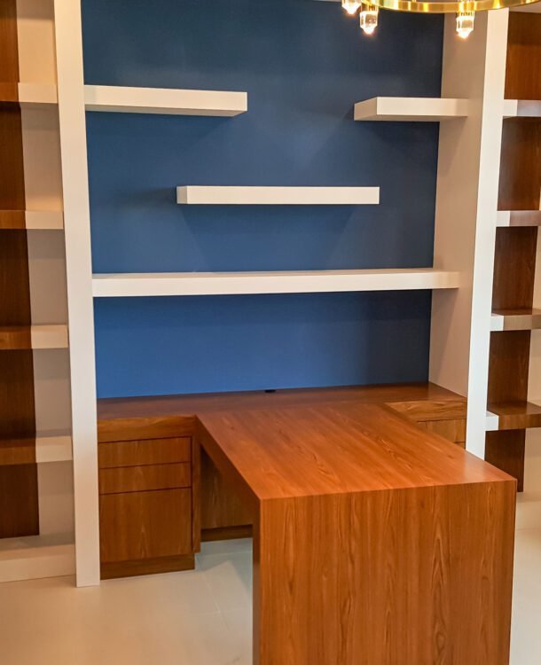 A sleek, contemporary office with custom high-gloss white cabinets and handle-less doors. The minimalist design incorporates floating shelves, a built-in desk, and ample storage for a clean, uncluttered look that enhances productivity.