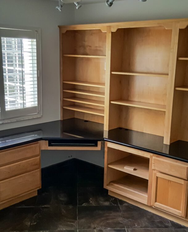 A sophisticated office with custom walnut cabinetry featuring a high-gloss finish. The design includes built-in bookshelves, a large desk with file drawers, and integrated lighting, creating a luxurious and professional workspace.